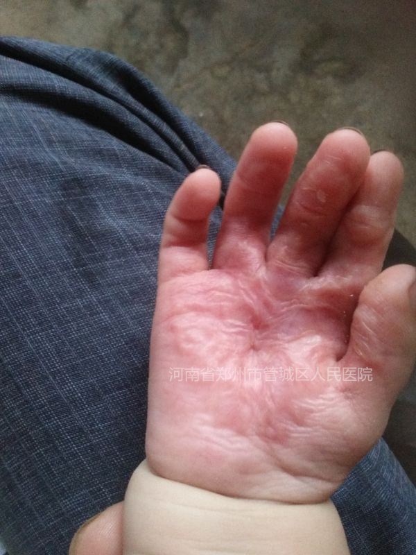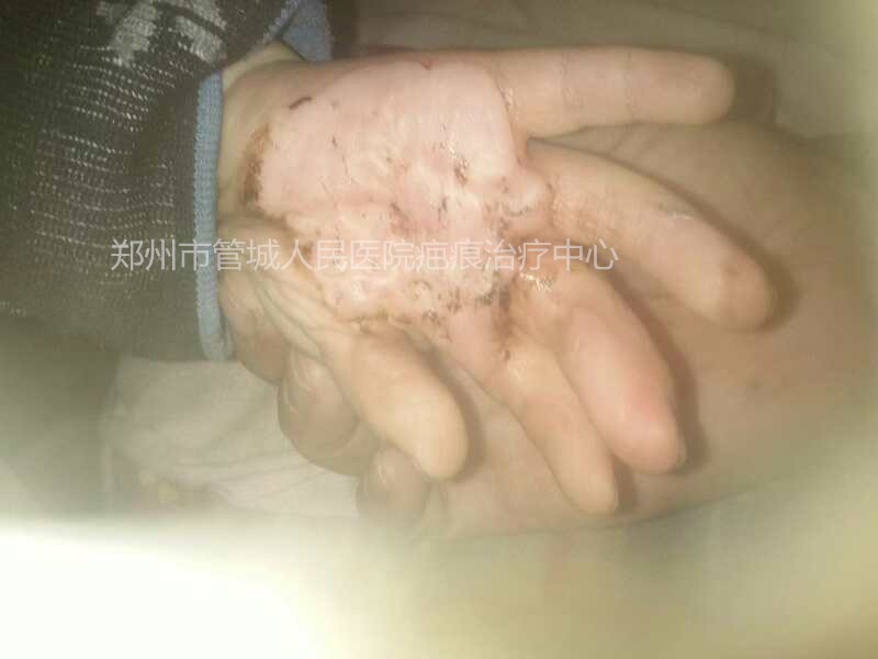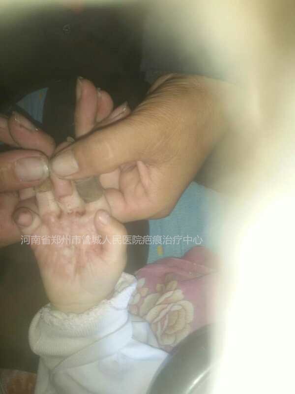 照片是孩子父母发过来的,照得不是很清楚,不过仔细看下也能看出手指头上的疤痕疙瘩完全好了,手掌的疤痕也基本平复了,情况很好.